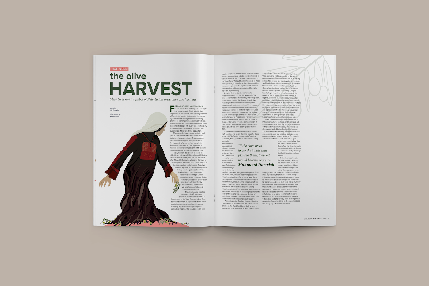 I illustrated a Palestinian woman emerging from an olive tree, her dress or thobe adorned with traditional Palestinian embroidery. The design symbolizes how Palestinians draw strength, resilience, and identity from their deep cultural roots.
