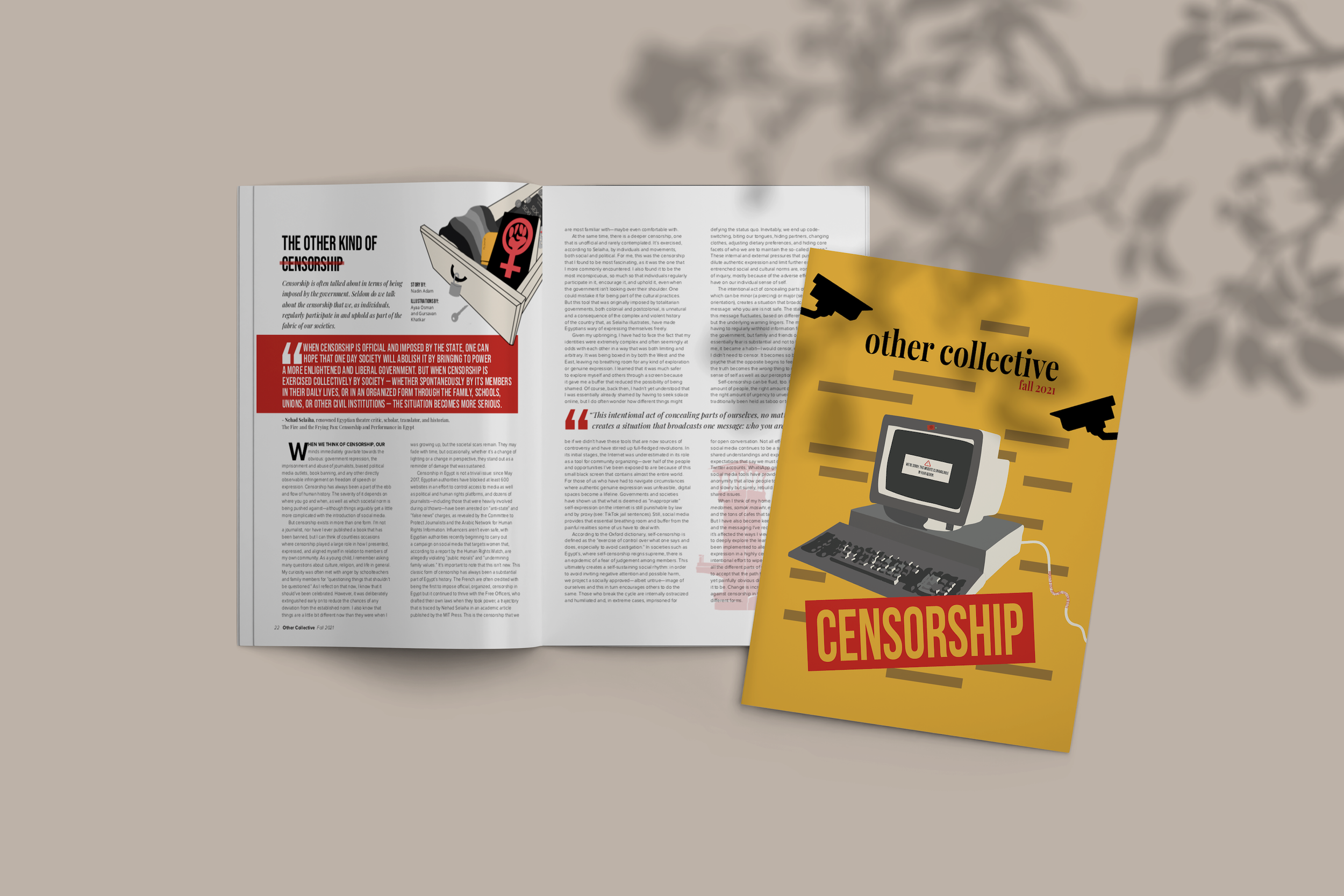 Hoping to convey elements of censorship throughout this magazine, the team and I implemented a lot with censor bars, surveillance cameras, text strike-though, and other elements of censorship. I designed the cover of this issue by focusing it on the core of censorship today—digital screens. I drew a piece of tape attempting to cover the camera of the computer which is simultaneously recording without the user's consent. The pop-up message ("This website is unavailable in your region") is one many of us see as greater powers attempt to control the media that we consume.